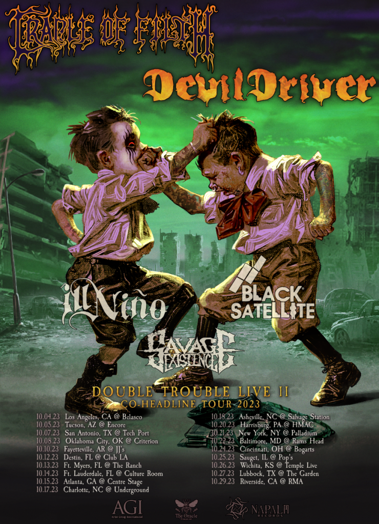 Extreme metal icons CRADLE OF FILTH and groove metal pioneers DEVILDRIVER are primed to embark on the second leg of their “Double Trouble Live” co-headlining tour! The follow-up to the duo’s successful summer run in the states, “Double Trouble Live II” will kick off in Los Angeles, CA on October 4, making its way through 19 cities before ending in Riverside, CA on October 29.