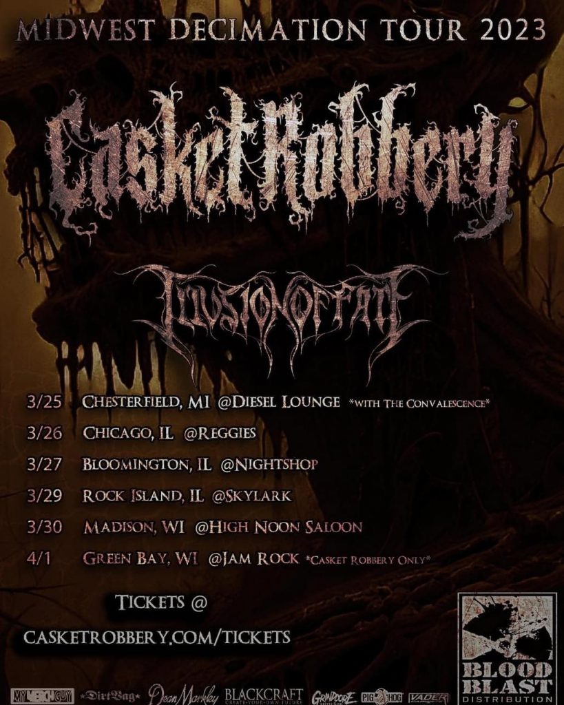 The first leg of the tour, dubbed “The No Survivors Tour,” will see CASKET ROBBERY perform alongside The Convalescence and Ignominious. These dates are followed by the “Midwest Decimation Tour” that puts the band in the headlining spot with direct support from Illusion of Fate.