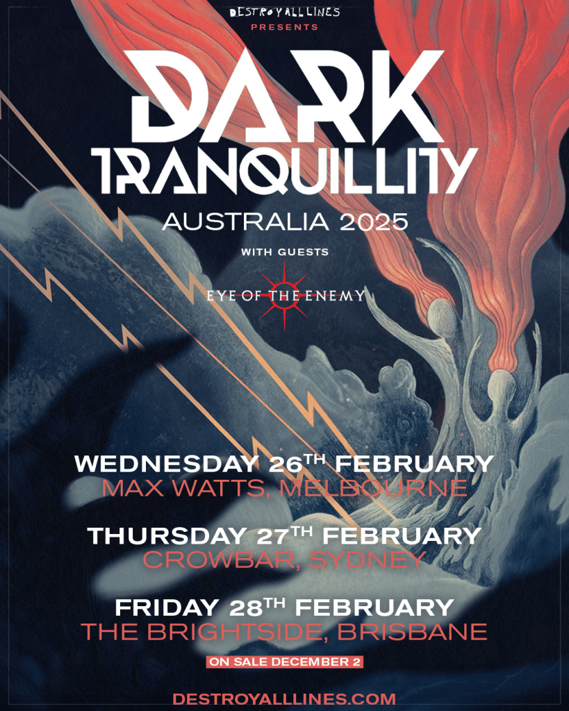 Joining Dark Tranquillity for their momentous return are Melbourne’s own melodic metal heavyweights, Eye of the Enemy. Renowned for their crushing riffs and soaring melodies, Eye of the Enemy has earned accolades including a Global Metal Apocalypse Award and numerous Album of the Year mentions. With a history of international tours and supporting the who’s who of metal’s elite, they’re the perfect complement to Dark Tranquillity’s atmospheric mastery.