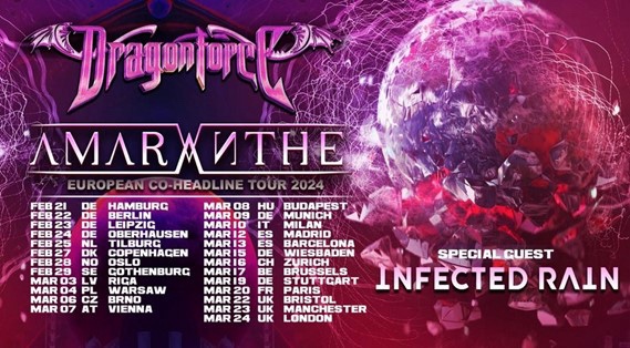 DRAGONFORCE recently finished their massively successful North American headline tour, which featured a brand-new setlist and stage production, as well as special guests AMARANTHE, NANOWAR OF STEEL and EDGE OF PARADISE on several sold out dates! Now, DRAGONFORCE is preparing for their epic European co-headline tour with AMARANTHE and special guests INFECTED RAIN. Kicking off in February 2024 in Hamburg, the tour is selling out fast with shows already sold out months in advance. Get your tickets while they last! Check out the music video for the new version of “Doomsday Party” (feat. Elize Ryd) below!!