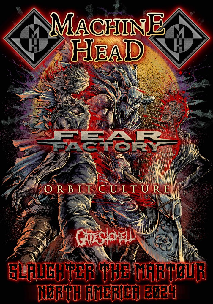 In an electrifying announcement that will cause anticipatory convulsions through the world of metal, Bay Area icons MACHINE HEADhave announced the first leg of their ‘Slaughter The Martøur Nørth America 2024‘ tour. Forgoing their “An Evening With…” format for the first time in a decade, MACHINE HEAD will have LA’s cyber-metal masters FEAR FACTORY, Sweden’s ORBIT CULTURE, and Louisville, KY’s GATES TO HELL in tow guaranteeing your 2024 starts off as heavy as humanly possible!