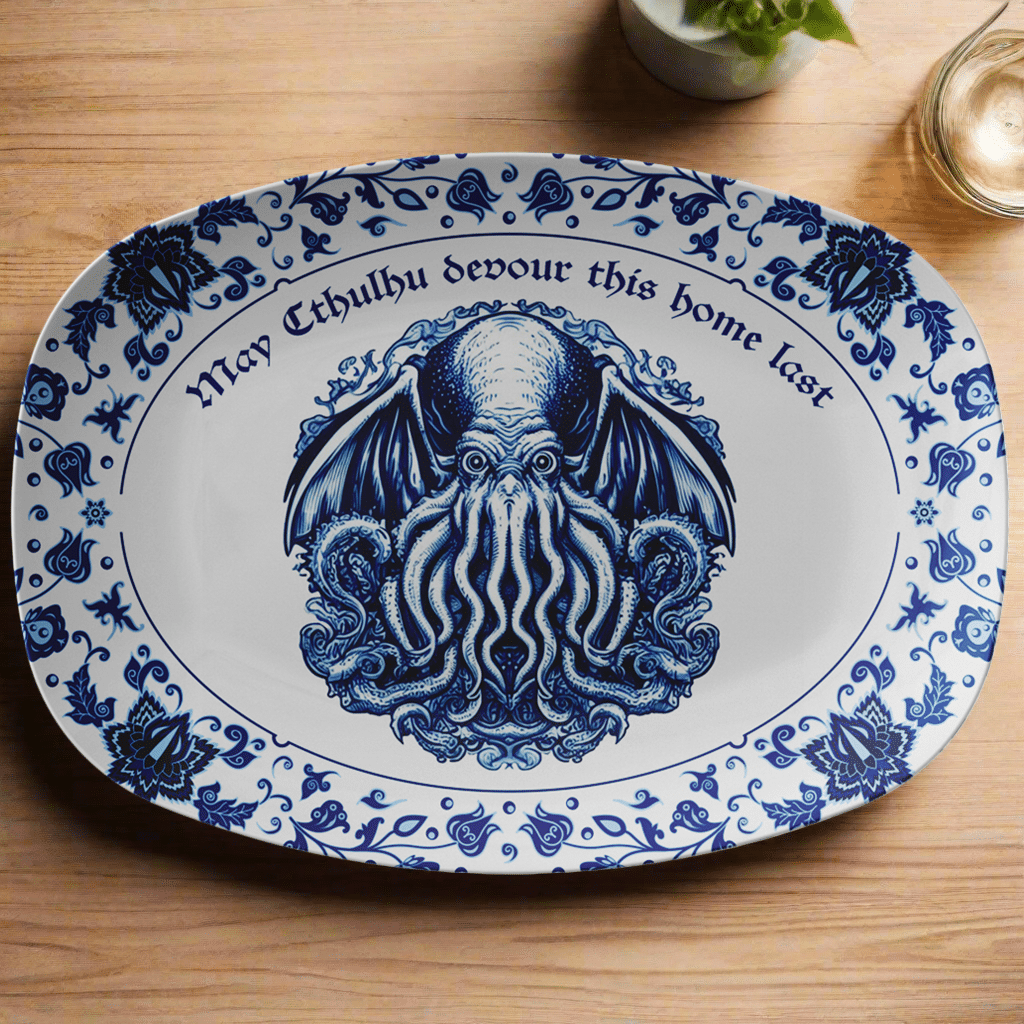 Serve your snacks with a side of cosmic dread. This 10×14 platter blends vintage china styling with full-blown eldritch horror. Perfect for hosts who enjoy a little Lovecraft with their leftovers. A charming reminder that if the Great Old One ever rises… maybe he’ll spare your place till dessert.