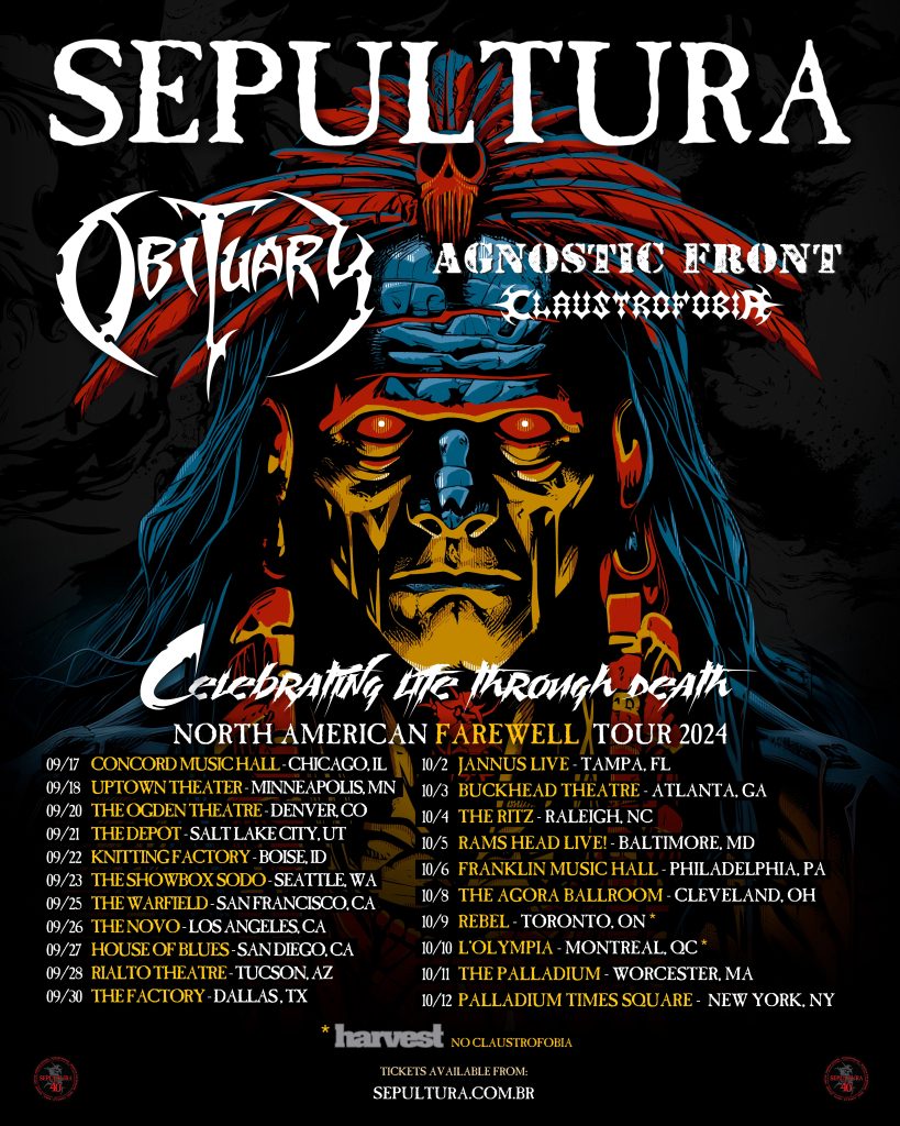 SEPULTURA ‘North American Farewell Tour 2024‘ with OBITUARY, AGNOSTIC FRONT and CLAUSTROFOBIA:
