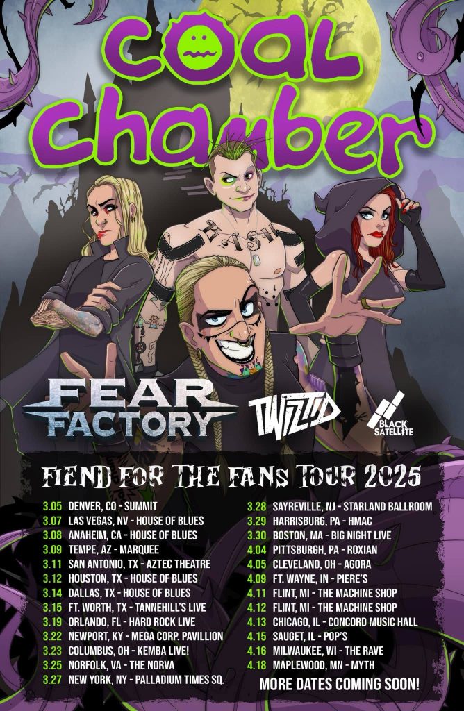 FEAR FACTORY‘s rescheduled ‘Fiend For The Fans Tour 2025‘ w/ COAL CHAMBER, TWIZTID, BLACK SATELLITE, WEDNESDAY 13: