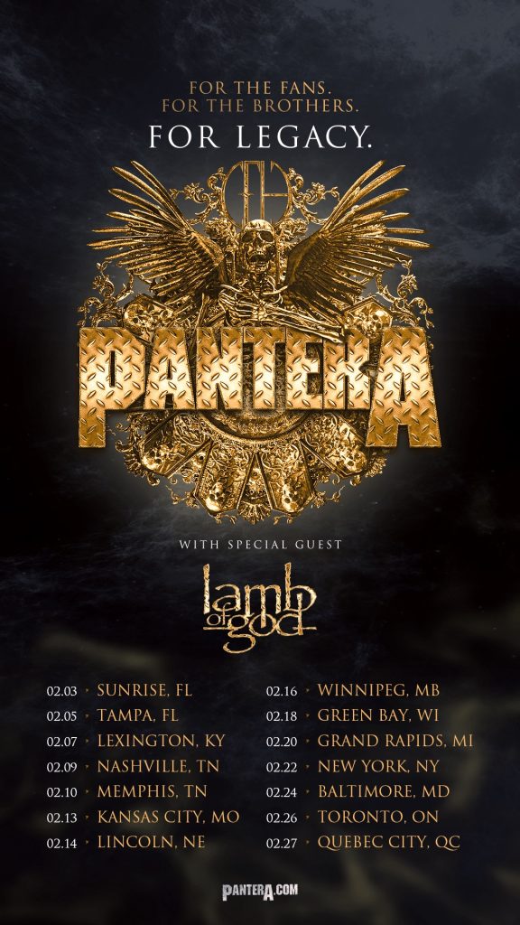 Heavy metal icons PANTERA will return to the stage this February on the second leg of their North American headlining tour. The journey follows the band’s massively successful twenty-city run this past Summer, a tour which stood as one of the most anticipated tours of 2023, as well as their dates supporting Metallica. Featuring classic members, vocalist Philip H. Anselmo and bassist Rex Brown, alongside guitarist Zakk Wylde and drummer Charlie Benante, the latest stretch of live dates continues the celebration of the lives of late founding members, drummer Vinnie Paul and guitarist Dimebag Darrell.