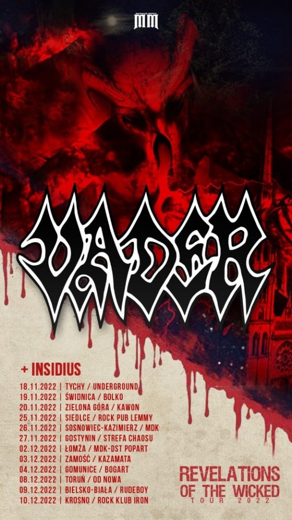“FATHERMANIAX!!!! We have surprising – but probably good – news for our local Fans in Poland. We managed to organize, together with Massive Music, a series of club concerts over four weekends at the turn of November and December! These will certainly be the last Vader concerts of 2022 – as well as in our country until the 2023 summer holidays… The unique note of this tour will be the album “Revelations”, which celebrates its 20th anniversary this year. In addition to some well-known tracks like “Epitaph” or “Revelation of Black Moses”, we’ll play songs that were never played in the entire history of Vader – including “When Darkness Calls”, “Wolftribe”, or “The Code”. Of course, we will supplement the set list with a powerful dose of “early Vader” as well as a series of Metal classics in the band version. We will also prepare for gadgets… but more details on that will be revealed soon. Colleagues from merciless INSIDIUS \m/ WELCOME to the bloody musical massacre !!!!”