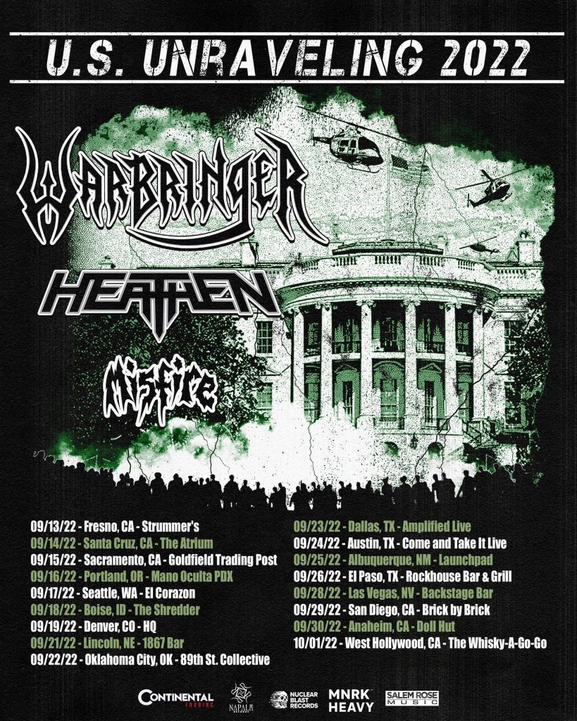 Warbringer is finally hitting the Western USA in support of ‘Weapons of Tomorrow.’ It’s been way too long, and the band is fired up as hell to get out there and bang some heads. The bill this time includes none other than legendary Bay Area thrashers Heathen, as well as Chicago’s Misfire. It’s looking like it will be a fantastic tour that will bring some serious riffs to the stage. Can’t wait to get back out there, and looking forward to seeing all of you raging at the shows.”