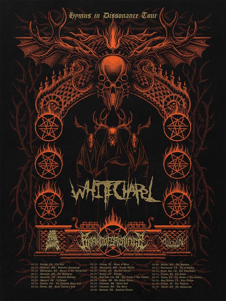 WHITECHAPEL will return to North American stages this Spring on a month-long headlining tour! The Hymns In Dissonance Tour runs from March 18th in Raleigh, North Carolina through April 19th in Atlanta, Georgia. Support will be provided by Brand Of Sacrifice, 200 Stab Wounds, and Alluvial. The journey follows WHITECHAPEL‘s recent sold out run with Lorna Shore.